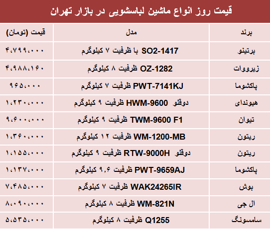 آنچه در زیر میآید جدول قیمت پرفروشترین انواع ماشین لباسشویی دربازار تهران است. شایان ذکر است که این نرخها ممکن است بر اساس برخی امکانات جانبی و خدمات پس از فروش در مناطق مختلف شهر تا ۱۰ درصد تفاوت قیمت داشته باشد.