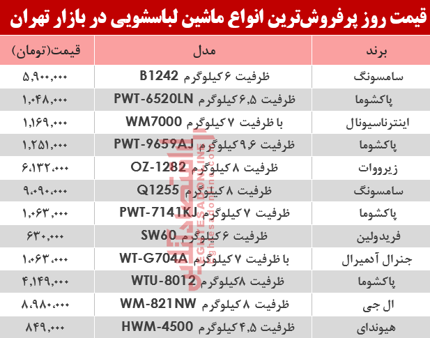 آنچه در زیر میآید جدول قیمت پرفروشترین انواع ماشین لباسشویی دربازار تهران است.