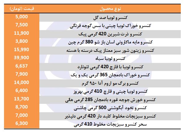 قیمت انواع کنسرو در بازار به شرح زیر است: