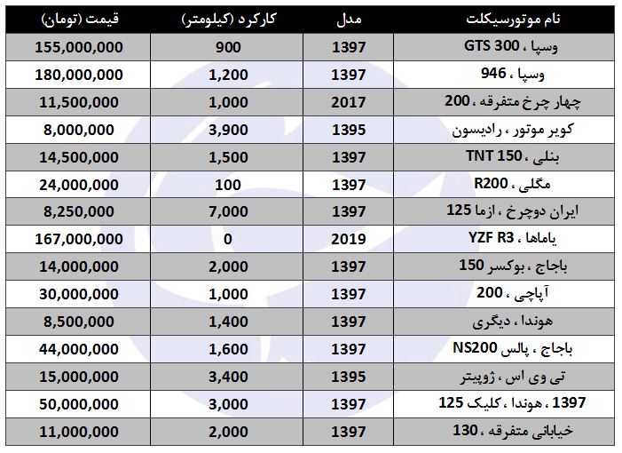 موتورسیکلتهای کارکرده چند قیمت است؟