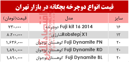 آنچه در زیر می آید جدول قیمت پرفروش‌ترین انواع دوچرخه بچگانه دربازار تهران است‌.