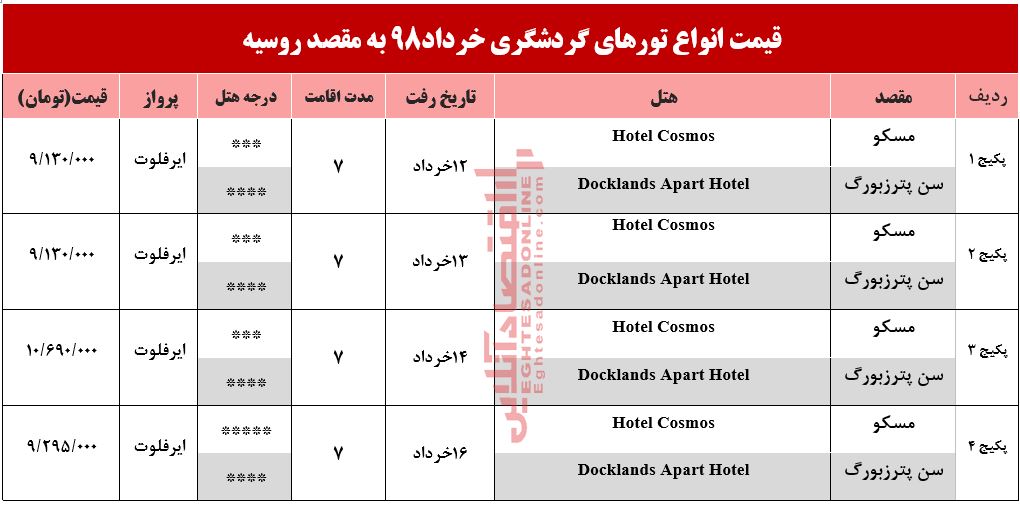 قیمت انواع تورهای گردشگری به مقصد روسیه در اردیبهشت۹۸ به شرح جدول زیر است.