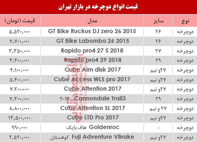 آنچه در زیر می آید جدول روز قیمت روز انواع دوچرخه سایز بزرگ در سطح بازار است.