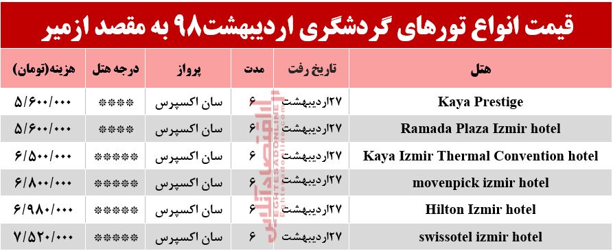 قیمت انواع تورهای گردشگری به مقصد ازمیر در اردیبهشت۹۸ به شرح جدول زیر است.