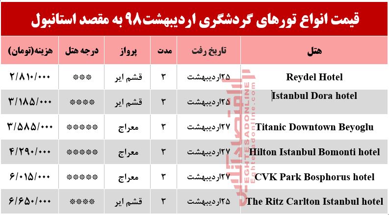قیمت انواع تورهای گردشگری به مقصد استانبول در اردیبهشت۹۸ به شرح جدول زیر است.