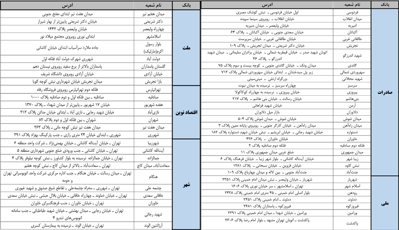 به گزارش خبر فوری به نقل از روابط عمومی بانک مرکزی، لیست شعب منتخب توزیع کننده سکه های رایج یک هزاریالی، ۲ هزار ریالی و ۵ هزار ریالی به شرح ذیل می باشد: