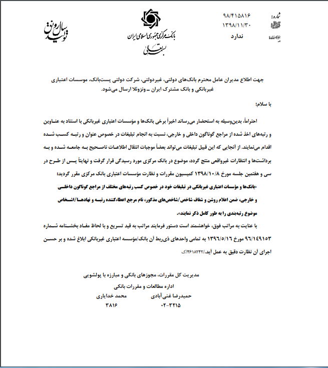 بانک مرکزی در بخشنامهای به بانکها و مؤسسات اعتباری غیر بانکی اعلام کرد: اخیراً برخی بانکها و مؤسسات اعتباری غیربانکی با استناد به عناوین و رتبههای اخذشده از مراجع گوناگون داخلی و خارجی نسبت به انجام تبلیغات در خصوص عنوان و رتبه کسب شده اقدام مینمایند، از آنجایی که این قبیل تبلیغات میتواند موجبات انتقال اطلاعات ناصحیح به جامعه شده و به برداشتها و انتظارات غیرواقعی منتج گردد، موضوع در بانک مرکزی مورد رسیدگی قرار گرفت و نهایتاً پس از طرح در سی و هفتمین جلسه کمیسیون مقررات و نظارت مؤسسات اعتباری بانک مرکزی مقرر شد: