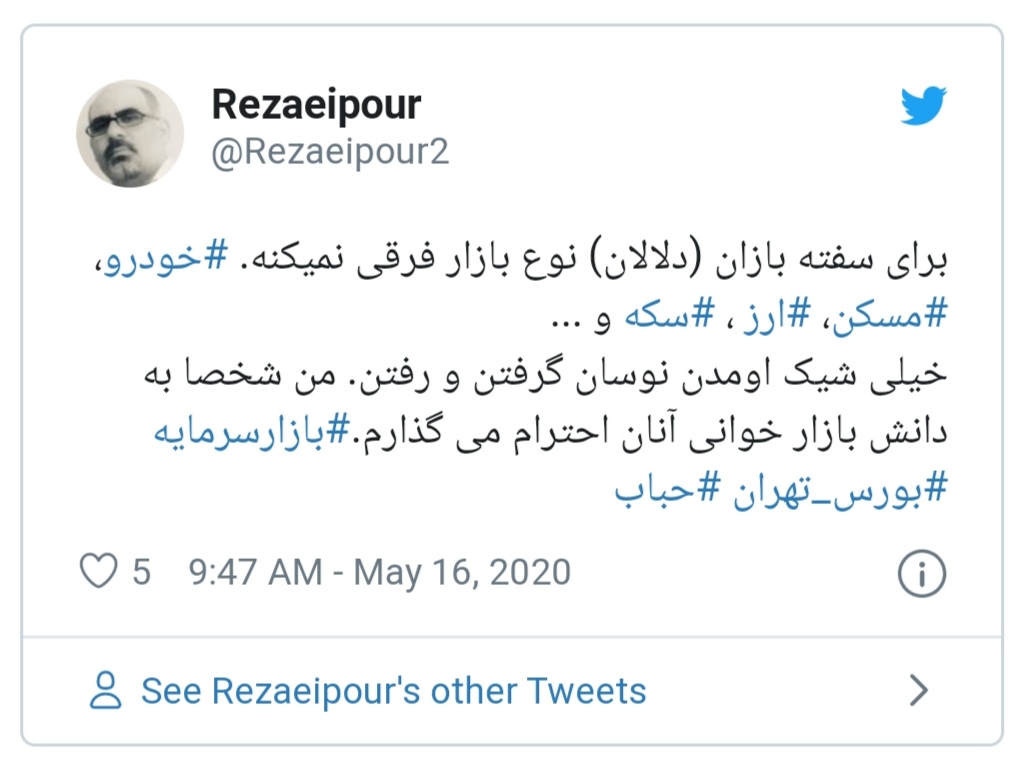 نوسان گیر.دلال .بورس باز.رانت خوار .کوه خوار .دریا خوار. جنگل خوار.کویر خوار.و....همه این خوارها فرزندان برومند فرهنگ متعالی اسلامی ما هستن!!!؟؟؟همه پرورش یافته چهل سال مکتب انقلابی ما هستند!؟مایه تاسف است.میفرماید .امدند نوسان گرفتند ورفتند .ببخشید مگر کاروانسرا است .دولت خواب مجلس خواب. نظارت خواب وقت بیداری نشده .قوانین جهت هدایت به سمت تعادل است نه برای بستر سازی جهت انتفاع نوسان گیر ها و...خوارها...تا وقتی از این خوارها ووابستگانشان به صورت مویرگی در همه ارکان ریشه دوانده اند .این خوارها یا به بورس هجمه میبرند یا به خودرو یا به ارز سکه مسکن و.... خاک گور هم چشم دنیا پرست این قبیله را سیر نمیکند .لیکن با تازیانه قوانین واجرای دقیق چند درصدی میتواتن از این انحطاط کاست به شرط ها وشروط ها وحذف بسیاری از فروض وشروط ها....