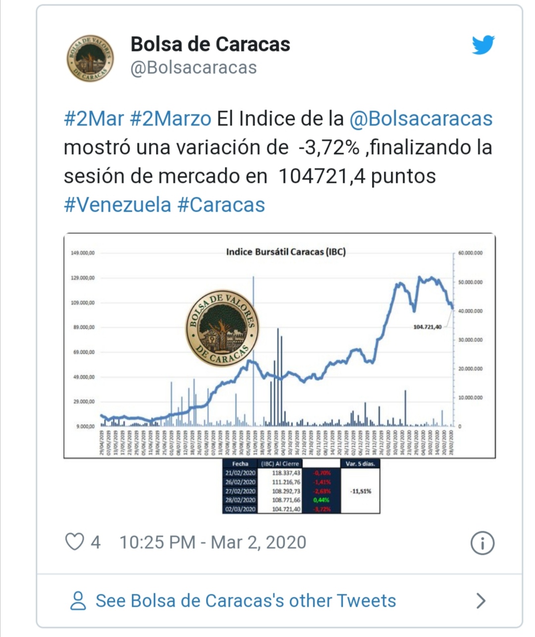بنا بر اعلام بورس ونزوئلا شاخص این بازار به ۶۲۸ درصد رشد از ۱۷ هزار و ۷۰۰ واحد در پایان آوریل سال ۲۰۱۹ به ۱۲۹ هزار واحد در فوریه گذشته صعود کرده است. شاخص بورس ونزوئلا پس از تجربه اصلاح قیمت‌ها در فوریه گذشته به روند رو به رشد خود ادامه داده و در حال حاضر از مرز ۲۹۳ هزار واحد نیز عبور کرده است.