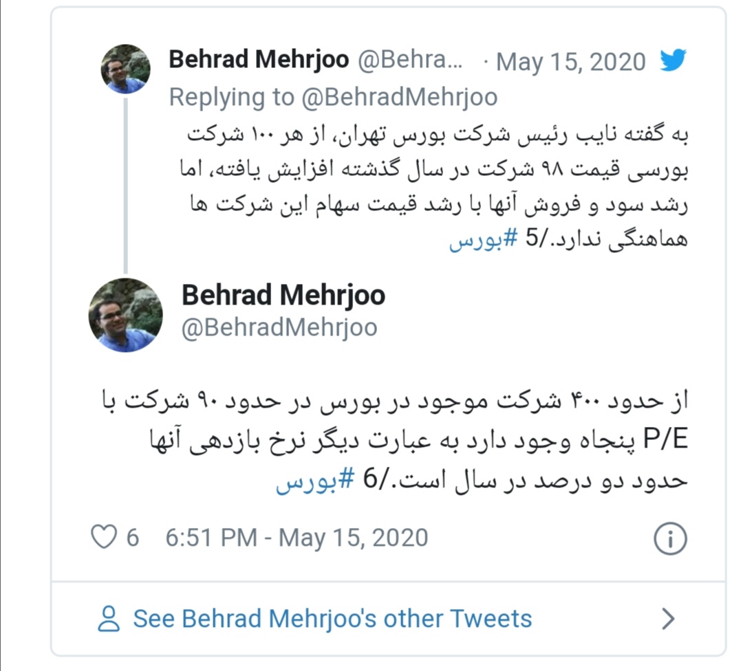 مساله‌ای که بنا بر توییت‌های بهراد مهرجو، مسئول بخش اقتصادی روزنامه سازندگی مورد اذعان مقام‌های بورس تهران نیز هست. به طوری که نایب رئیس بورس تهران گفته که رشد قیمت حدود ۹۸ درصد شرکت‌های عضو بورس تهران با رشد سود و فروش آنها هماهنگی ندارد. آقای مهرجو همچنین یادآوری کرده که قیمت هر سهم حدود ۲۲ درصد شرکت‌های فعال در بورس تهران به ۵۰ برابر سود پیش‌بینی شده برای هر سهم آنها رسیده است.