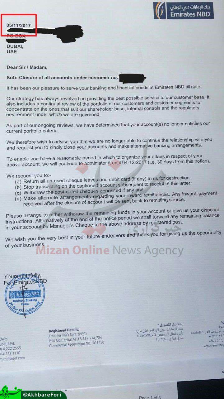 به گزارش خبر فوری به نقل از میزان، براساس نامهای که گروهی از تجار ایرانی فعال در امارات در اختیار خبرگزاری میزان قرار دادهاند، بانک "امارات ان بی دی" یکشنبه هفته گذشته ادعا کرده است "به عنوان بخشی از بررسیهای در حال انجام، ما به این نتیجه رسیدهایم که بیش از این حسابهای شما متناسب با معیارهای ما نیستند."