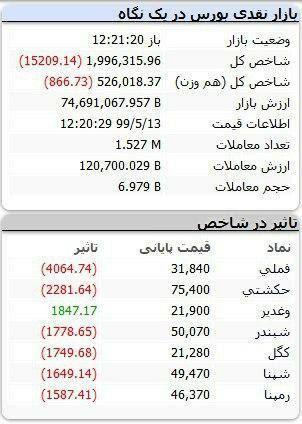 شاخص کل بورس تهران با 1.13 درصد کاهش، به زیر دو میلیون واحد برگشت. 22 هزار و 748 واحد کاهش، شاخص کل را به عدد یک میلیون و 988 هزار و776 رساند.