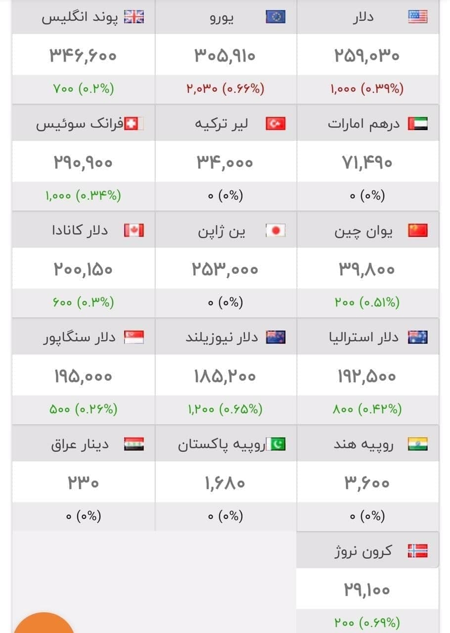 قیمت دلار امریکا در صرافی‌های رسمی کاهش یافت و هر دلار آمریکا در صرافی‌ها به نرخ ۲۵ هزار و 900 فروخته و به قیمت 24 هزار و 800 تومان از مشتریان خریداری می شود؛ همچنین هر یورو نیز به قیمت ۲۹ هزار و 500 تومان خریداری و ۳۰ هزار و 700تومان عرضه می شود.