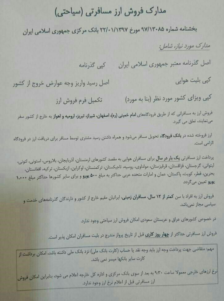 طبق بخشنامه شماره 97.13085 مورخ با1397.01.22 بانک مرکزی جمهوری اسلامی ایران پرداخت ارز مسافرتی یک بار در سال و به مبلغ حداکثر 1000 یورو خواهد بود. مدارک مورد نیاز برای دریافت ارز مسافرتی در تصویر زیر قابل مشاهده است.