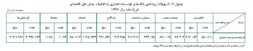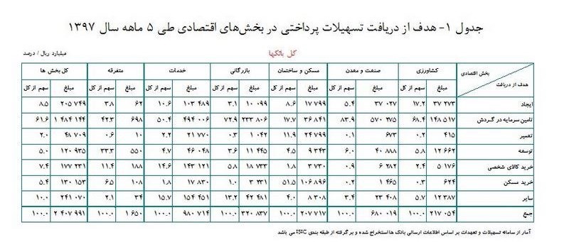 بر اساس این گزارش تعداد 99204 فقره تسهیلات به بخش صنعت و معدن با میانگین پرداختی هر فقره 6.9 میلیارد ریال پرداخت شده که بیشتر از میانگین پرداختی سایر بخشها است. در بخش خدمات نیز تعداد 1918933 فقره تسهیلات با میانگین پرداخت هر فقره 0.5 میلیارد ریال پرداخت شده است.