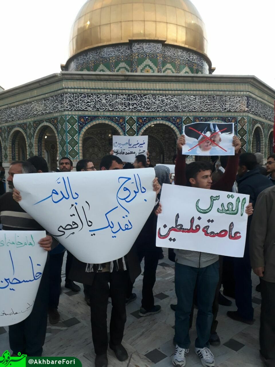 جمعی از جوانان ایرانی در اعتراض به توطئه آمریکایی_صهیونیستی علیه قدس شریف در صحن قدس حرم امام رضا (ع)، تجمع کردند.