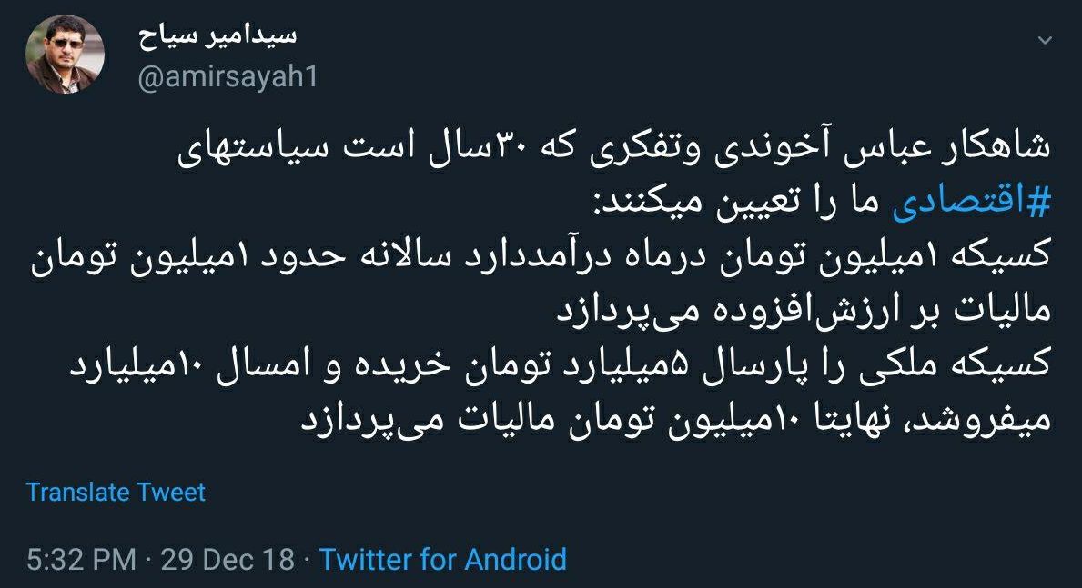 امیر سیاح فعال رسانه در صفحه شخص خود درباره عباس آخوندی طی توییتی نوشت: