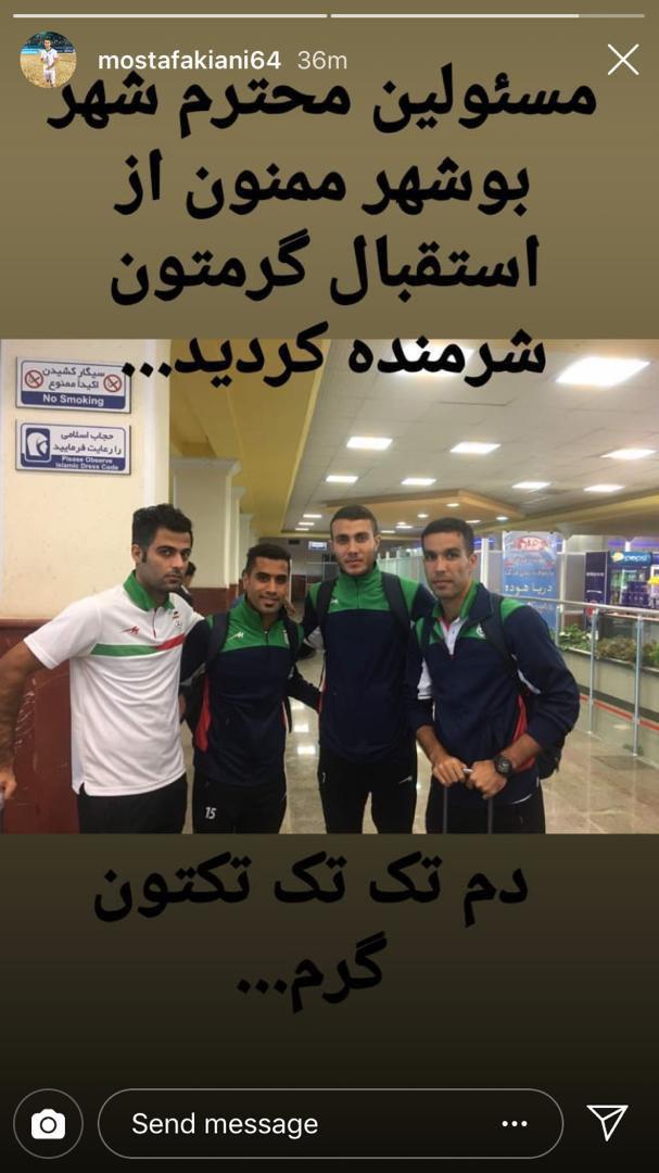 اما در بازگشت چهار ملی پوش بوشهری به زادگاه خویش هیچ یک از مدیران استانی و شهری برای استقبال از آنها به فرودگاه نیامده بودند! جز خانواده های بازیکنان. مصطفی کیانی یکی از چهار ملی پوش بوشهری تیم ملی فوتبال ساحلی بعد از مواجهه با این اتفاق در استوری اش نوشت: مسئولین محترم شهر بوشهر ممنون از استقبال گرمتون، شرمنده کردید. دم تک تک تکتون گرم!