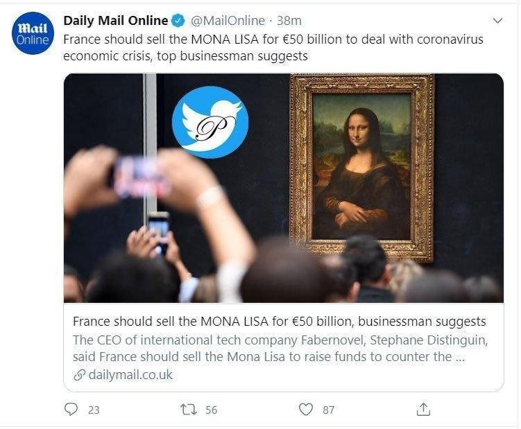 استفان دیستینگوین مدیر کمپانی فناورانه Fabernovel پیشنهاد کرد تا فرانسه تابلوی مونالیزا را به قیمت 50 میلیارد یورو برای پشت سرگذاشتن بحران مالی ناشی از کروناویروس بفروشد.