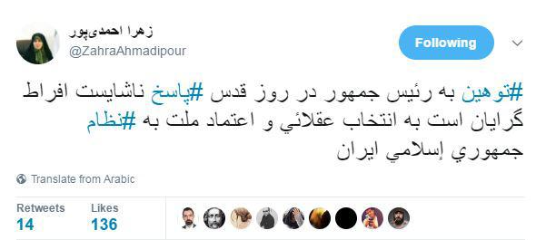 واکنش زهرا احمدی پور، معاون رئیس جمهوری و رئیس سازمان میراث فرهنگی به توهین به روحانی در حاشیه مراسم روز قدس