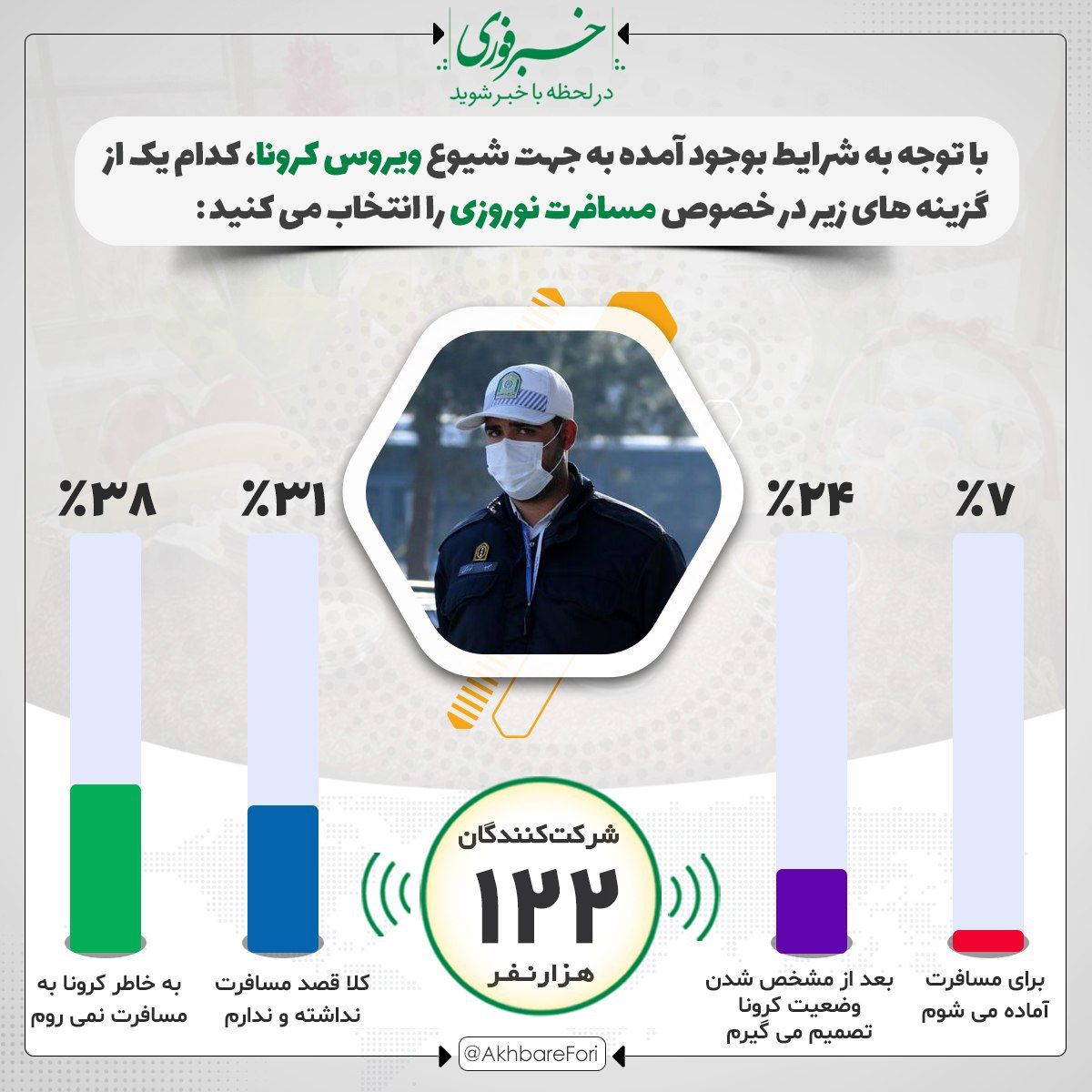 باتوجه به شرایط شیوع کرونا در ایران، یک نظرسنجی با این عنوان که "تصمیم شما برای سفر نوروزی چیست؟!" انجام شد و ۱۲۲۰۵۴ نفر در این نظرسنجی شرکت کردند.
