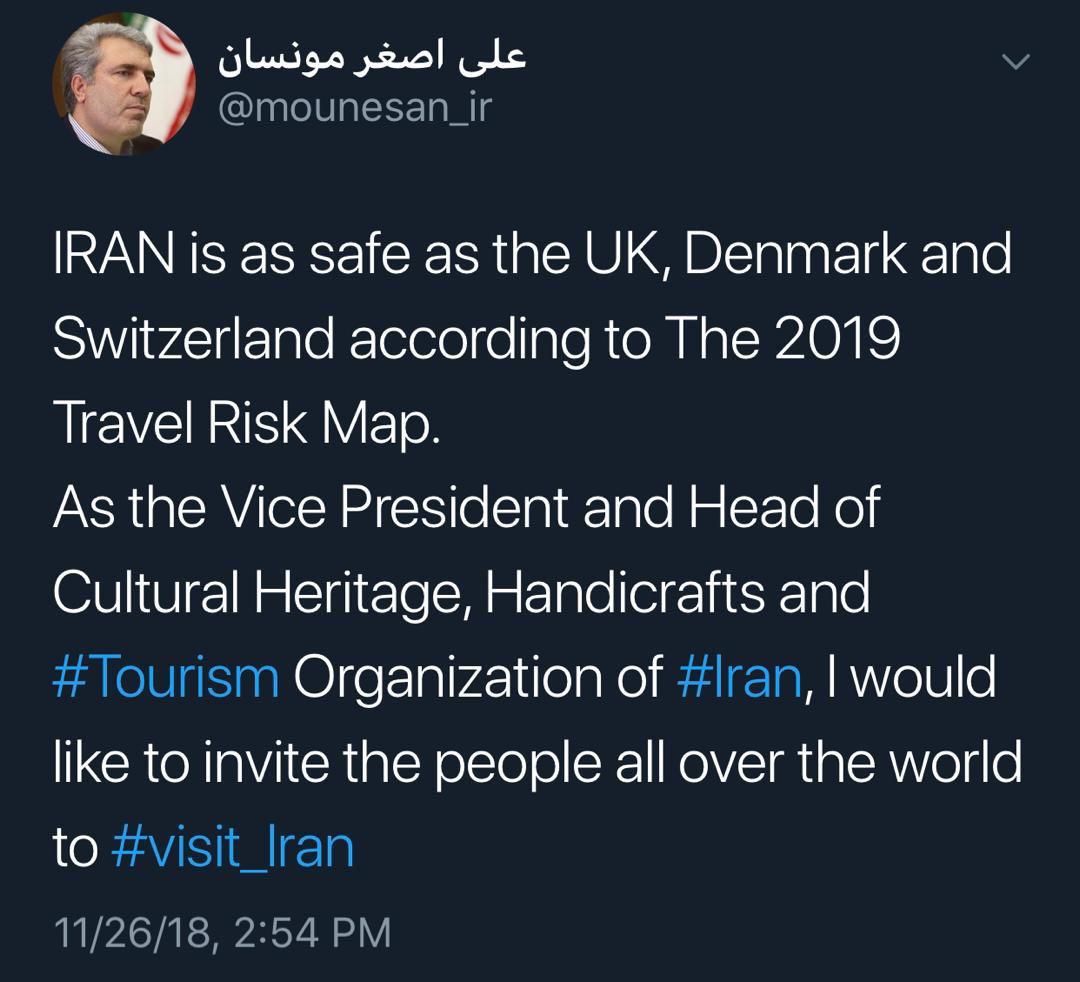 علی اصغر مونسان رئیس سازمان میراث فرهنگی و گردشگری در توئیتی از مردم جهان دعوت کرد تا به ایران سفر کنند.