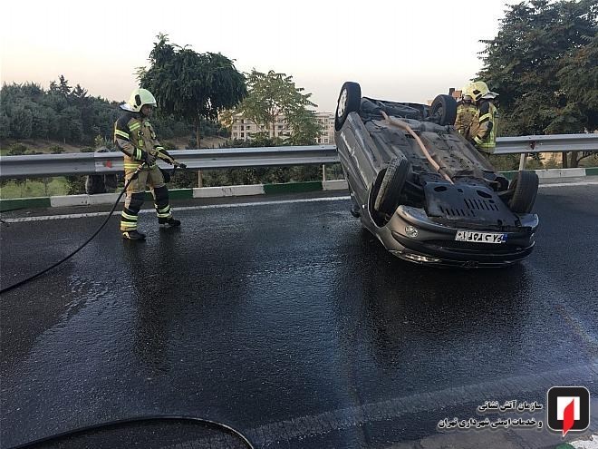 خودروی پژو ۲۰۶ در بزرگراه ستاری در حال حرکت بود که کنترل خودرو حین ورود به بزرگراه آبشناسان از دست راننده خارج و بر روی سقف واژگون شد.