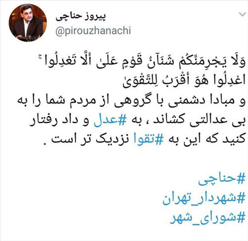 در مقابل پیروز حناچی شهردار منتخب شورای شهر تهران در واکنش به حواشی در مورد برادرش پيمان حناچی با اشارهای به آیات قرآن کریم مبنی بر دوری از بیعدالتی و رفتار براساس عدل و داد توصیه کرد.
