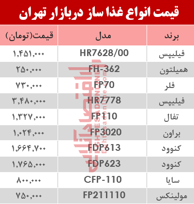 آنچه در زیر می آید جدول قیمت روز برخی از انواع غذا ساز عرضه شده در سطح بازار تهران است.
