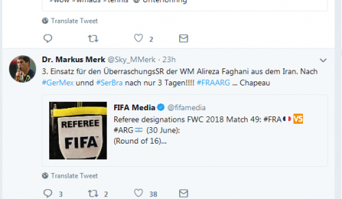 مارکوس مرک در حساب توئیتر خود درباره انتخاب علیرضا فغانی برای داوری دیدار آرژانتین و فرانسه نوشت: