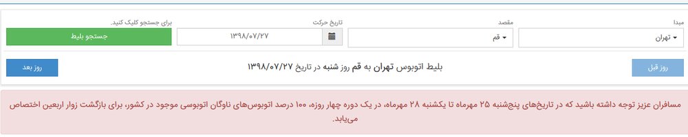 یکی از سایتهای فروش بلیت اتوبوس در تمام مسیرها و روزهای هفته، پیام زیر را برای کاربران به نمایش گذاشته است: