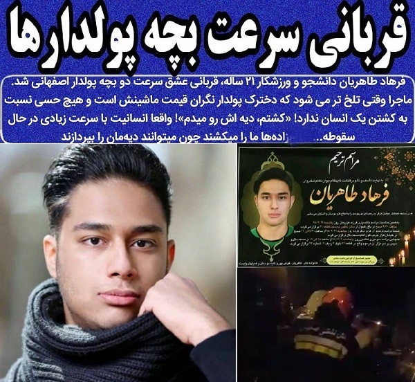 فرهاد طاهریان نفر سوم این ماجرای خونین است. جوان ٢١ سالهای که در این تصادف مرگبار جانش را از دست داد. پسر بزرگ خانواده و دانشجوی مهندسی کامپیوتر بود. آن طور که اقوام فرهاد میگویند او برای بنزین زدن به خیابان کارگر اصفهان رفته بود: «فرهاد اصلا اهل دور دور نبود، آن شب هم رفته بود تا در خیابان کارگر بنزین بزند. اما دیگر بازنگشت، تا این که فرداشب اسم او را در لیست بیمارستان دیدیم.البته لیست افراد فوت شده.»