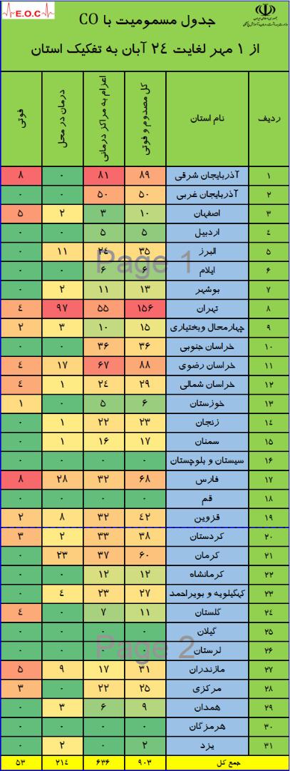 پیرحسین کولیوند، رییس سازمان اورژانس کشور درباره آخرین آمار مسمومیت با co از ۱ مهر لغایت ۲۴ آبان ۱۳۹۸ گفت: در مجموع تعداد ۹۰۳ نفر بر اثر گازگرفتگی مسموم و یا فوت شدهاند. از این تعداد ۶۳۶ نفر به بیمارستان منتقل و ۲۱۴ نفر در محل درمان شدهاند.