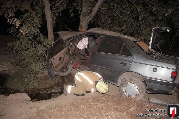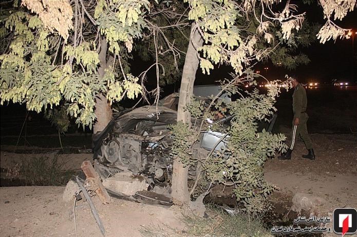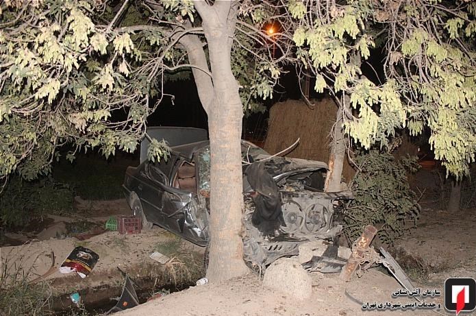 یک دستگاه خودروی سواری پژو 405 به علت نامعلوم پس از انحراف از مسیر اصلی و برخورد با دو درخت در زمینهای کشاورزی متوقف شده و هر چهار سرنشین خودرو که دو مرد 22 و 23 و دو زن 19 و 20 ساله بودند، دچار مصدومیت شده بودند.