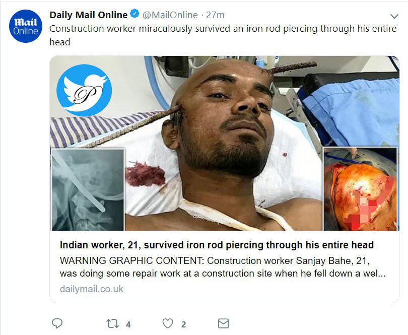 زنده ماندن کارگر ۲۱ ساله هندی بعد از فرورفتن میلگرد در سرش