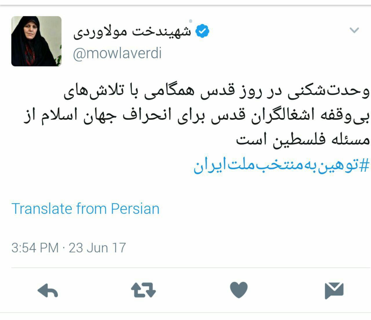 شهیندخت مولاوردی، معاون رئیس جمهور در امور زنان و خانواده با انتشار مطلبی در توییترش به ماجرای توهین به رییس جمهور در روز قدس واکنش نشان داد.