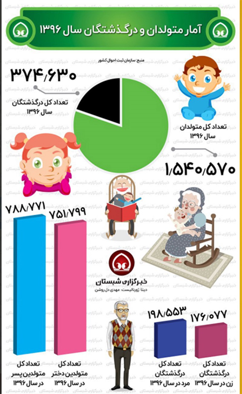 در اینفوگرافیک زیر نشان داده شده که در سال 96 چند ايراني از دنيا رفتند و چند دختر و پسر ايراني به دنيا آمدند؟