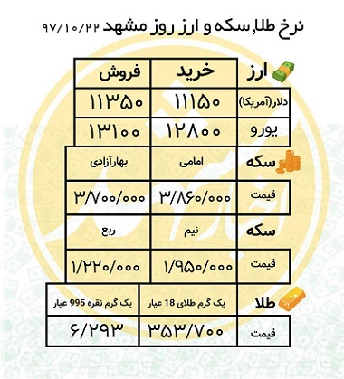 قیمت سکه، طلا و ارز روز شنبه 22دیماه سال 1397 بازار مشهد را در ادامه مشاهده می کنید.