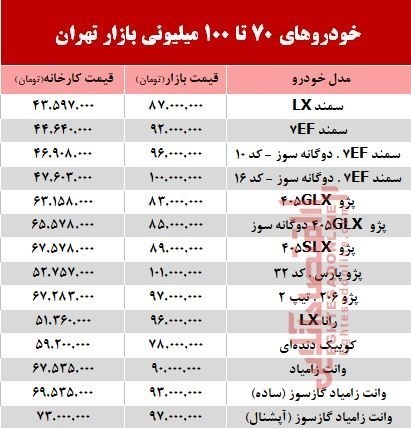 قیمت خودروهای ۷۰ تا ۱۰۰میلیونی بازار تهران + جدول