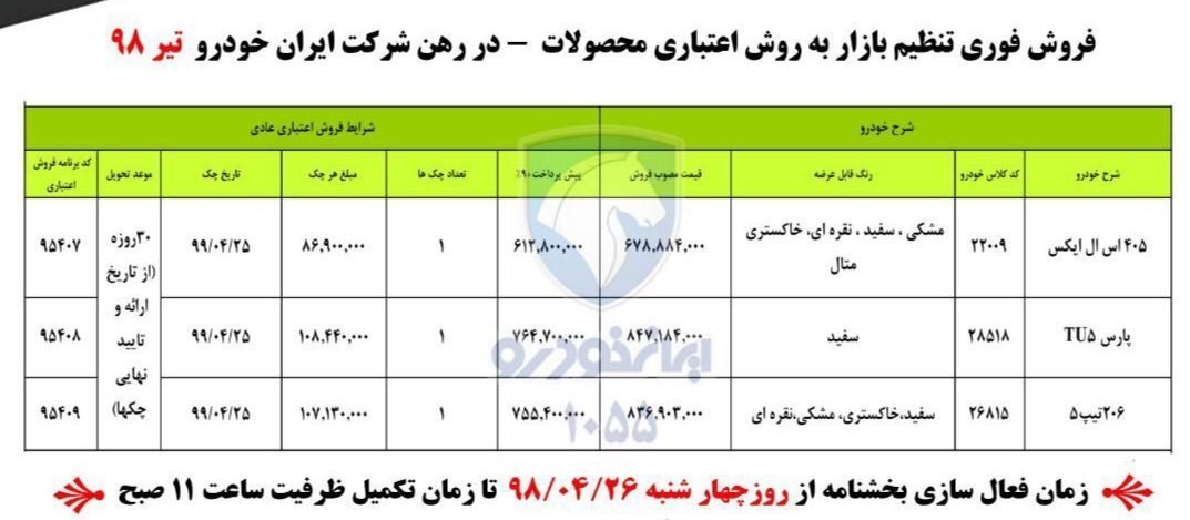 امروز ایران خودرو شرایط فروش فوری 3 محصول خود را برای تنظیم بازار اعلام کرد. این طرح فروش از ساعت ١١ صبح چهارشنبه 26 تیرماه 98 با تحویل 30 روزه آغاز می شود.