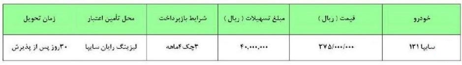 جزئیات طرح فروش فوری اعتباری پراید ۱۳۱ که با تسهیلات ۴ میلیون تومانی لیزینگ رایان سایپا و در وبسایت گروه خودروسازی سایپا آغاز می شود به شرح جدول ذیل است: