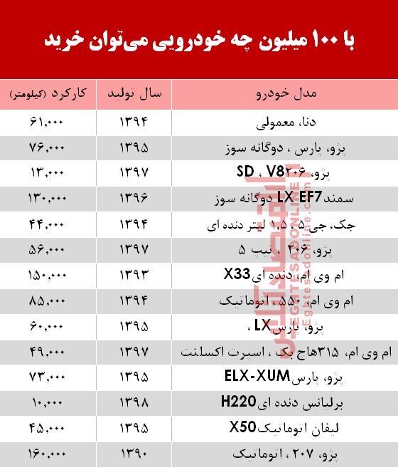 با ۱۰۰ میلیون‌ چه خودرویی می‌توان خرید؟ / جدول