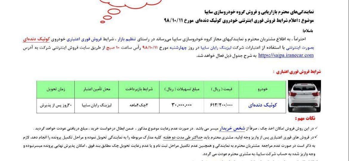 سایپا از ساعت ۱۰ صبح فردا فروش اینترنتی کوییک دنده ای را آغاز خواهد کرد.