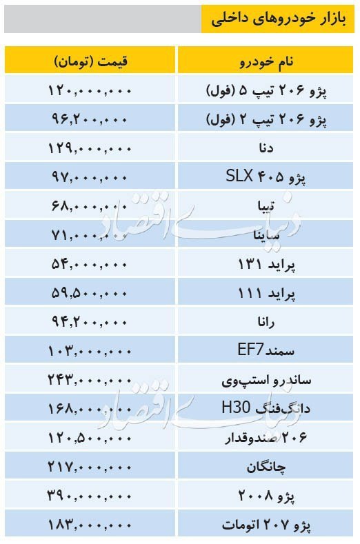 روزنامه دنیای اقتصاد جدول قیمت خودروهای داخلی در بازار را منتشر کرده است.
