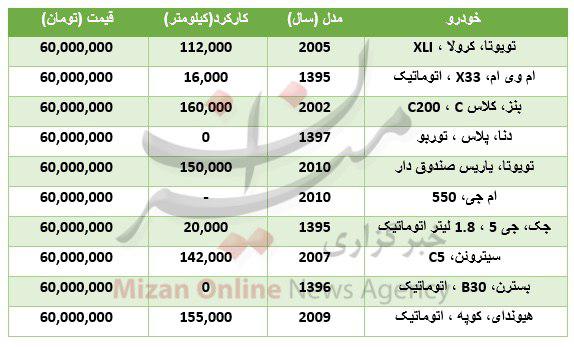 با 60 میلیون تومان می توانید خودروهایی شامل تویوتا کرولا XLI، ام وی ام X33 اتوماتیک، بنز کلاس C C200، دنا پلاس توربو، تویوتا یاریس صندوق دار و موارد مشابه را خریداری کنید.