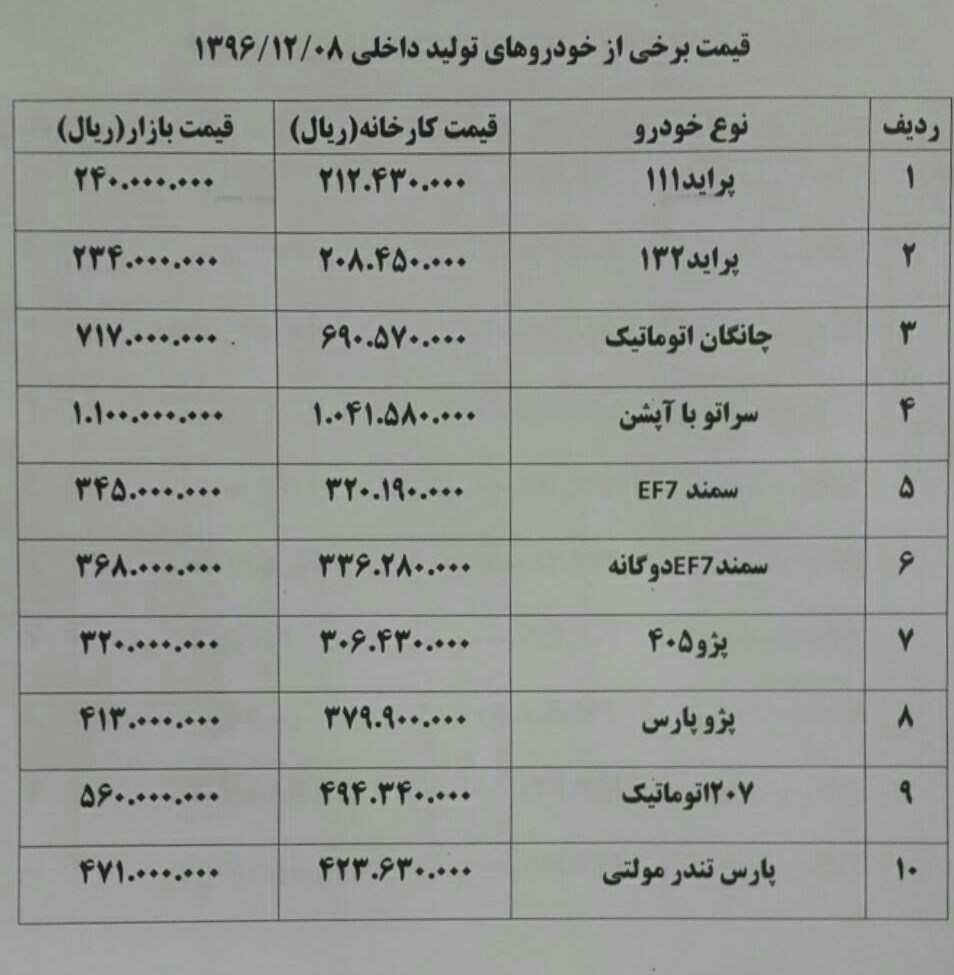 در حال حاضر دناپلاس 56 میلیون تومان، پژو 207 اتوماتیک 56 میلیون و 300 هزار تومان، پژو 405 SLX 34 34 میلیون و 300 هزار تومان، سمند LX 34 میلیون و 500 هزار تومان، پژو207 دنده ای 46 میلیون و 900 هزار تومان به فروش میرسد.