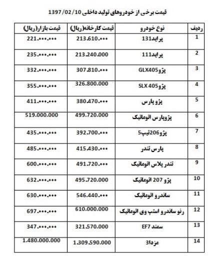 قیمت تعدادی از خودروهای داخلی در بازار امروز به شرح زیر است: