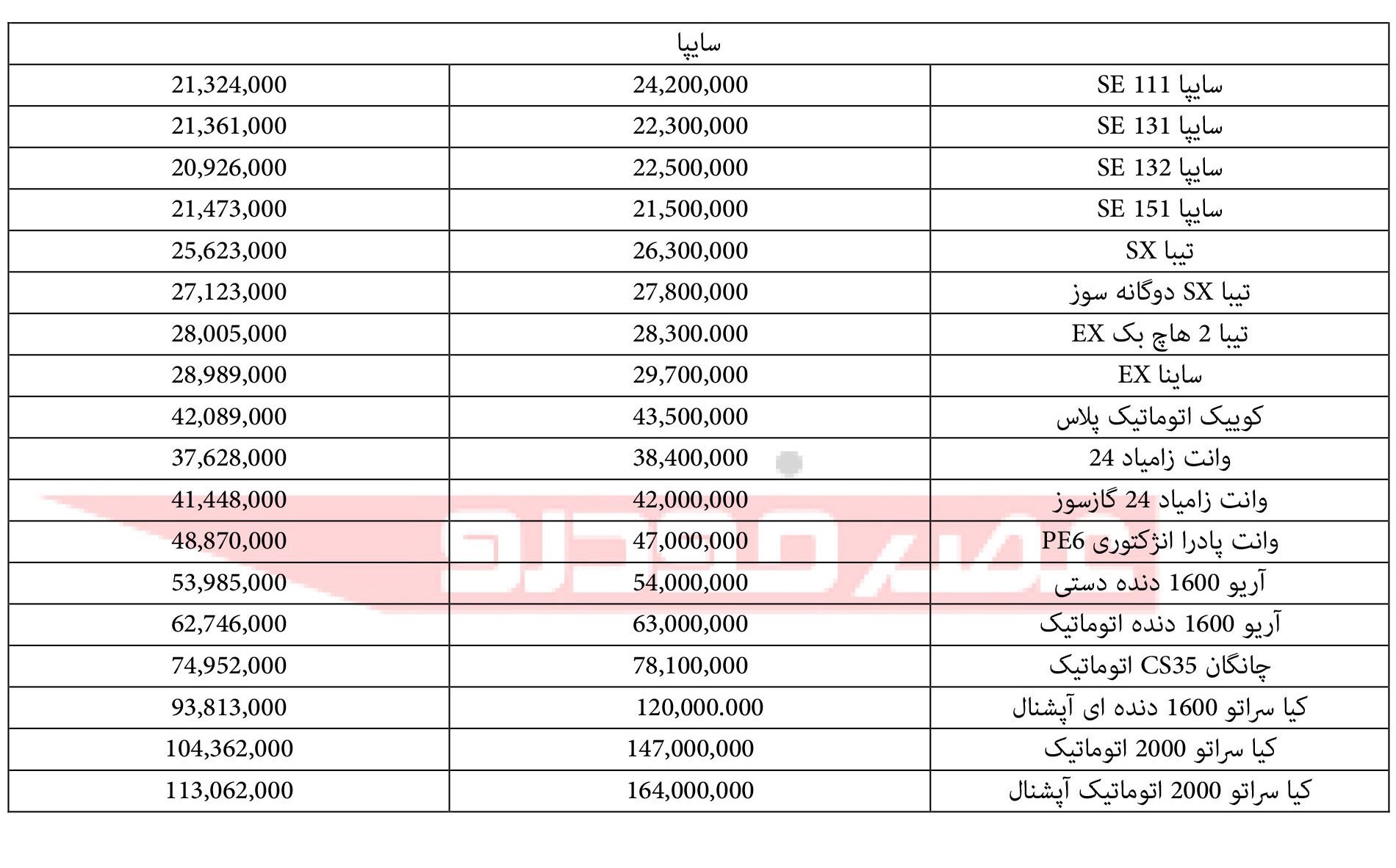 قیمت انواع محصولات سایپا در بازار و نمایندگی اعلام شد.