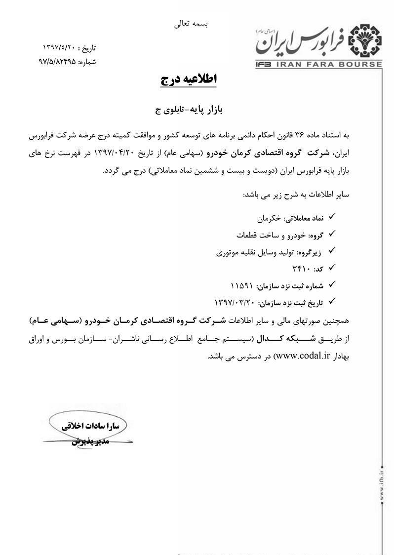 به استناد ماده ۳۶ قانون احکام دائمی برنامه های توسعه کشور و موافقت کمیته درج عرضه شرکت فرابورس ایران، گروه اقتصادی کرمان خودرو در فهرست نرخ های بازار پایه فرابورس ایران درج میشود.