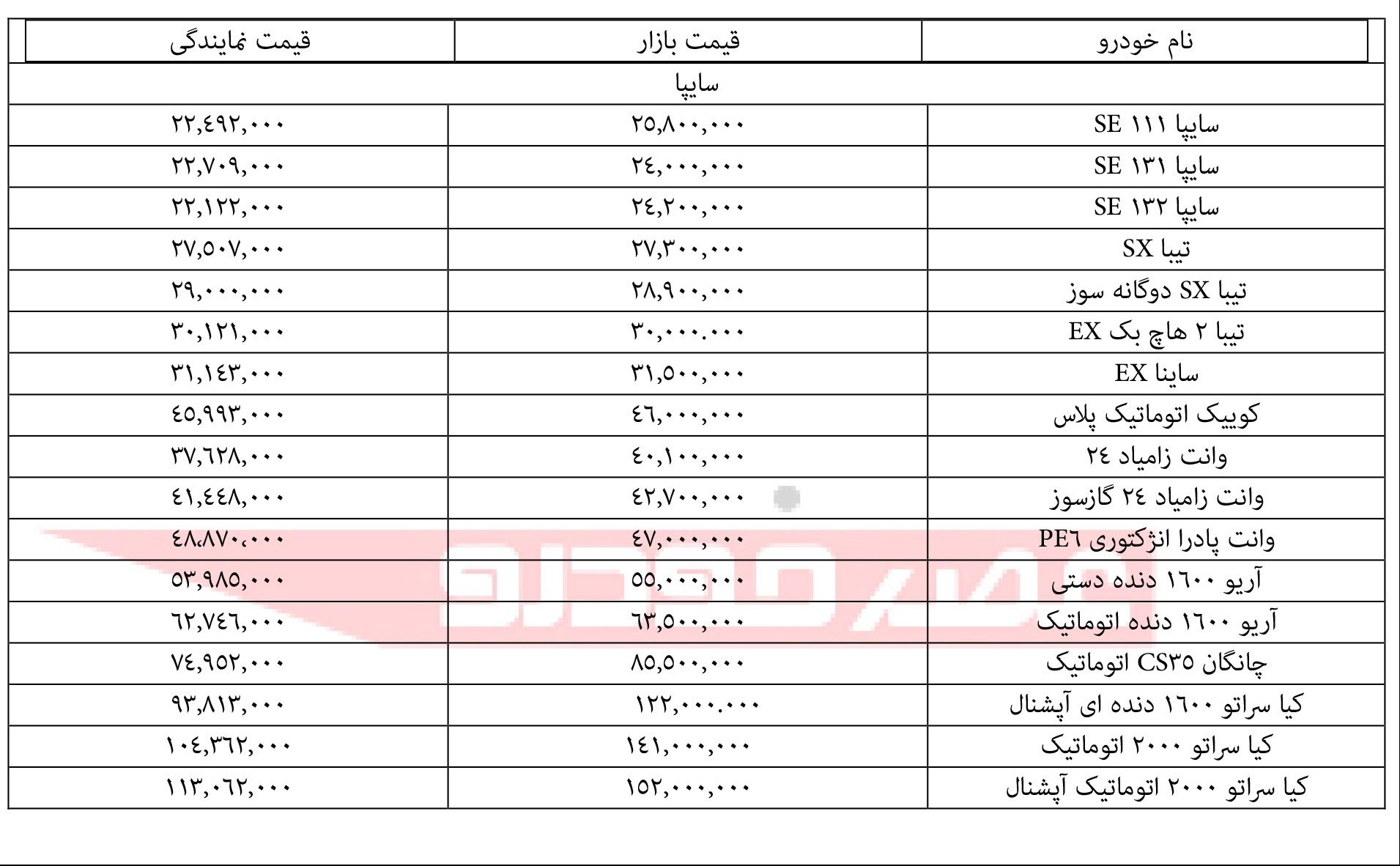قیمت انواع محصولات سایپا در بازار و نمایندگی به شرح زیر است: